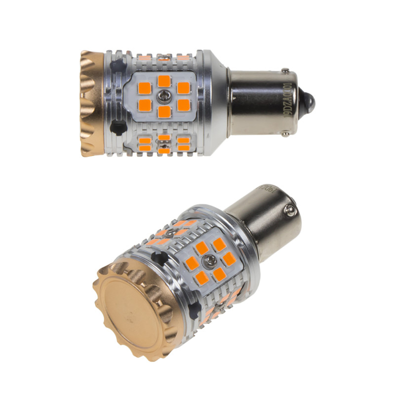 Nová generace LED autožárovek s paticí BAU15S, oranžová, 30x LED čip 3030SMD. Díky speciální vestavěné elektronice simuluje stejný odběr jako klasická žárovka a nehlásí chybu ve vozidlech se systémem hlídání prasklých žárovek. Určeno do směrových světel (blinkrů), žárovky blikají správnou rychlostí.