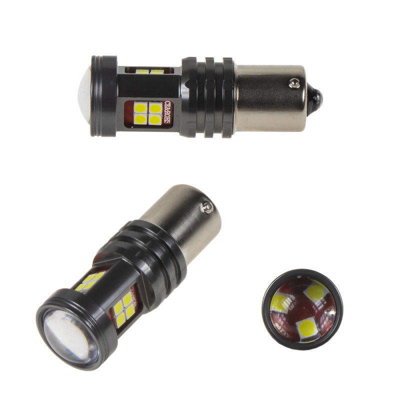 Nová generace LED autožárovek s paticí BAU15s, oranžová, 30x LED čip 3030SMD. Díky speciální vestavěné elektronice simuluje stejný odběr jako klasická žárovka a nehlásí chybu ve vozidlech se systémem hlídání prasklých žárovek. Určeno do směrových světel (blinkrů), žárovky blikají správnou rychlostí.