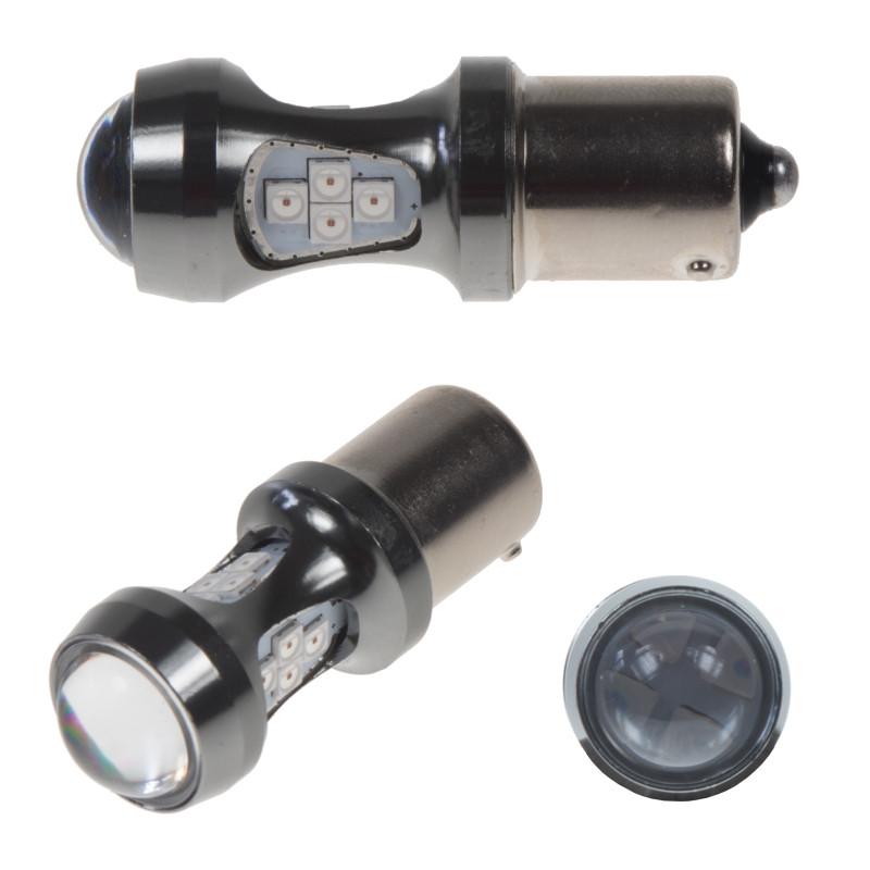 Nová generace LED autožárovek s paticí BAU15S, bílá, 12 x super svítivý LED čip 5 W + rozptylová krycí čočka.