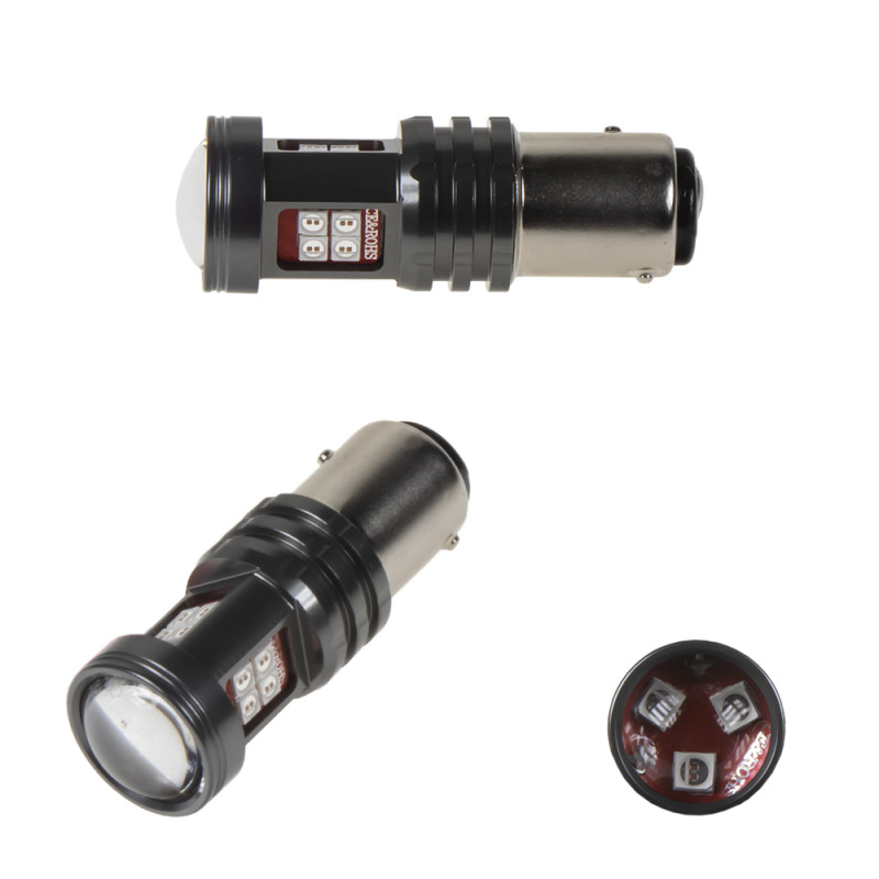 Nová generace LED autožárovek s paticí BAY15D (P21/5W) - dvouvláknová, červená, zepředu 1x super svítivý LED čip 3 W + rozptylová krycí čočka, z boku 12 SMD LED 5630.