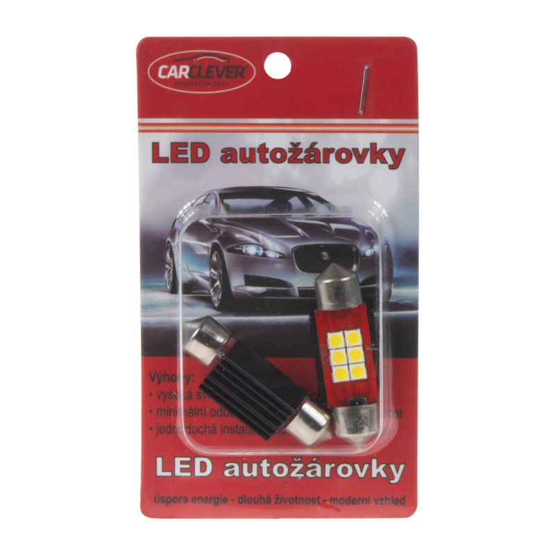 LED žárovka s paticí sufit (36 mm), bílá, s vestavěným rezistorem (nehlásí závady řídící jednotky na žárovce u nových vozidel) a chladičem, 6x vysocesvítivé SMD LED diody 2835SMD.