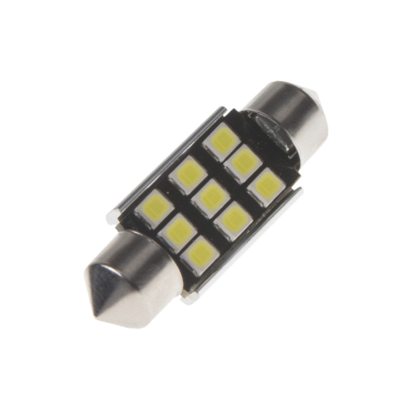 LED žárovka s paticí sufit (36 mm), bílá, s vestavěným rezistorem (nehlásí závady řídící jednotky na žárovce u nových vozidel) a chladičem, 3x vysocesvítivé 3-čipové SMD LED diody.