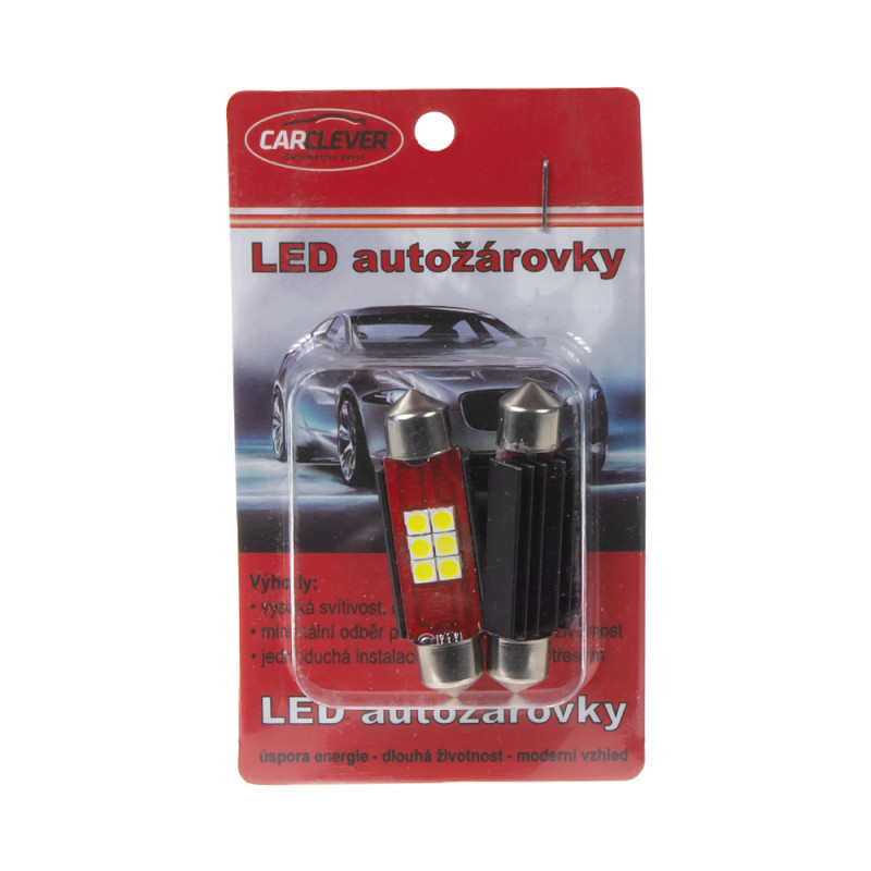 LED žárovka s paticí sufit (42 mm), bílá, s vestavěným rezistorem (nehlásí závady řídící jednotky na žárovce u nových vozidel) a chladičem, 6x vysocesvítivé SMD LED diody 2835SMD.