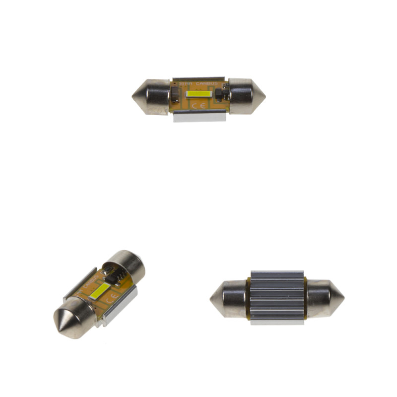 LED žárovka s paticí sufit (36 mm), bílá, s vestavěným rezistorem (nehlásí závady řídící jednotky na žárovce u nových vozidel) a chladičem, 3x vysocesvítivé 3-čipové SMD LED diody.