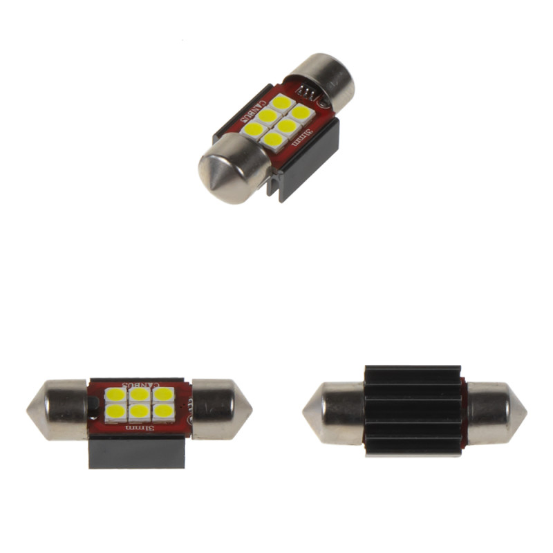 LED žárovka s paticí sufit (31 mm), bílá, s vestavěným rezistorem (nehlásí závady řídící jednotky na žárovce u nových vozidel) a chladičem, 6x vysocesvítivé SMD LED diody 2835SMD.