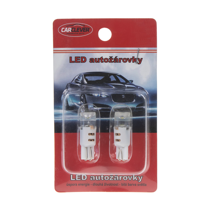 Náhradní LED žárovka s paticí T10, 2x super svítivá SMD LED 5730 + krycí čočka, s vestavěným rezistorem (nehlásí závady řídící jednotky na žárovce u nových vozidel), vhodná do parkovacích světel u novějších vozidel, odpovídá žárovce "celosklo" W5W. Svítivost LED diody je větší než u žárovky 12 V 5 W. Díky teplotě světla 6000 K jsou LED žárovky ideálním doplňkem do reflektorů s xenonovými výbojkami, kde žluté světlo obyčejné žárovky působí rušivě.