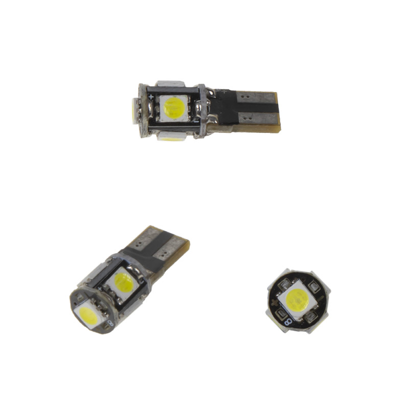 Náhradní LED žárovka s paticí T10, bílá, 5 x vysocesvítivé 3-čipové SMD LED diody, vhodná do parkovacích světel u novějších vozidel, odpovídá žárovce "celosklo" W5W. Díky teplotě světla 8000 K jsou LED žárovky ideálním doplňkem do reflektorů s xenonovými výbojkami, kde žluté světlo obyčejné žárovky působí rušivě.