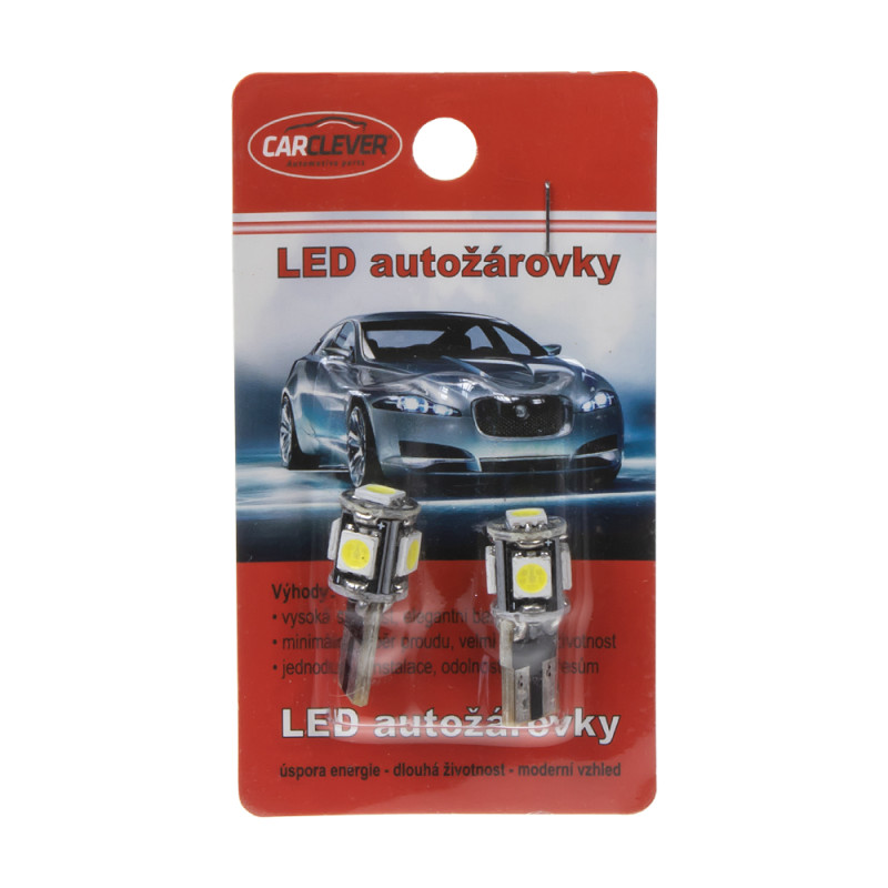 Náhradní LED žárovka s paticí T10, bílá, 5x vysocesvítivé 3-čipové SMD LED diody, vhodná do parkovacích světel u novějších vozidel, odpovídá žárovce "celosklo" W5W. Díky teplotě světla 8000 K jsou LED žárovky ideálním doplňkem do reflektorů s xenonovými výbojkami, kde žluté světlo obyčejné žárovky působí rušivě.