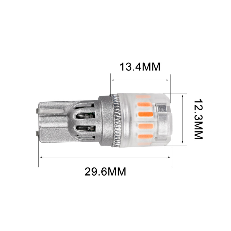 Náhradní oranžová LED žárovka s paticí T10, s vestavěným rezistorem ( nehlásí závady řídící jednotky na žárovce u nových vozidel), 3x vysocesvítivé 3-čipové SMD LED diody, vhodná do směrových světel u novějších vozidel, odpovídá žárovce "celosklo" W5W.