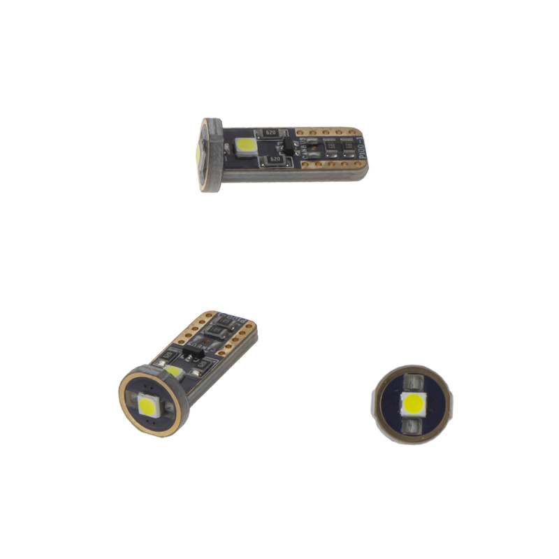 Náhradní LED žárovka s paticí T10, 6x super svítivá SMD LED 5630 + krycí čočka, s vestavěným rezistorem (nehlásí závady řídící jednotky na žárovce u nových vozidel), vhodná do parkovacích světel u novějších vozidel, odpovídá žárovce "celosklo" W5W. Svítivost LED diody je podstatně větší než u žárovky 12 V 5 W. Díky teplotě světla 6000 K jsou LED žárovky ideálním doplňkem do reflektorů s xenonovými výbojkami, kde žluté světlo obyčejné žárovky působí rušivě.