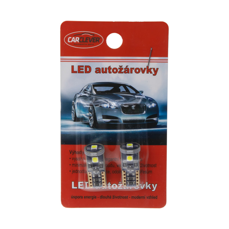 Náhradní LED žárovka s paticí T10, 1x 3-čipová SMD LED, vhodná do parkovacích světel u novějších vozidel, odpovídá žárovce "celosklo" W5W. Svítivost LED diody je podobná jako u žárovky 12 V 5 W. Díky teplotě světla 6000 K jsou LED žárovky ideálním doplňkem do reflektorů s xenonovými výbojkami, kde žluté světlo obyčejné žárovky působí rušivě.