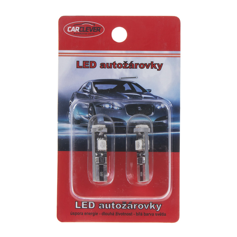 Náhradní LED žárovka s paticí T10, bílá, 5x vysocesvítivé 3-čipové SMD LED diody, vhodná do parkovacích světel u novějších vozidel, odpovídá žárovce "celosklo" W5W. Svítivost LED diody je podstatně větší než u žárovky 12 V 5 W. Díky teplotě světla 8000 K jsou LED žárovky ideálním doplňkem do reflektorů s xenonovými výbojkami, kde žluté světlo obyčejné žárovky působí rušivě.