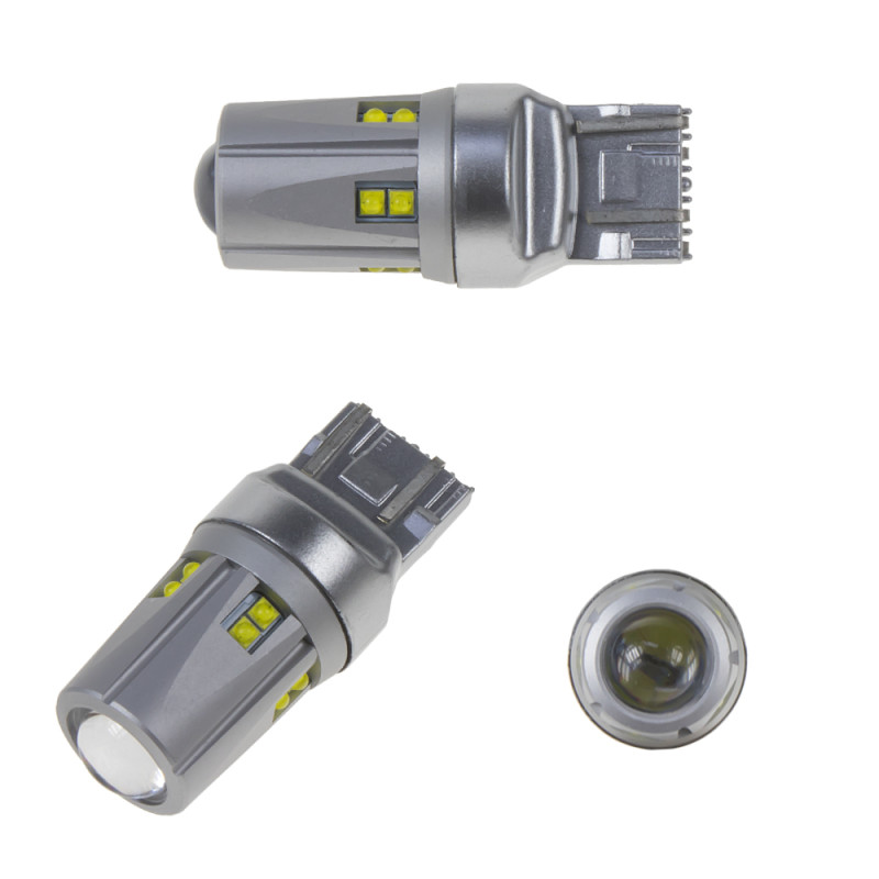 Náhradní oranžová LED žárovka s paticí T20 (3157 - W2,5x16d ), s vestavěným rezistorem ( nehlásí závady řídící jednotky na žárovce u nových vozidel), 16x vysocesvítivé 3-čipové SMD LED diody. Tato žárovka se používá především v automobilech dovezených z USA automobilky Dodge, Ford, Chrysler.