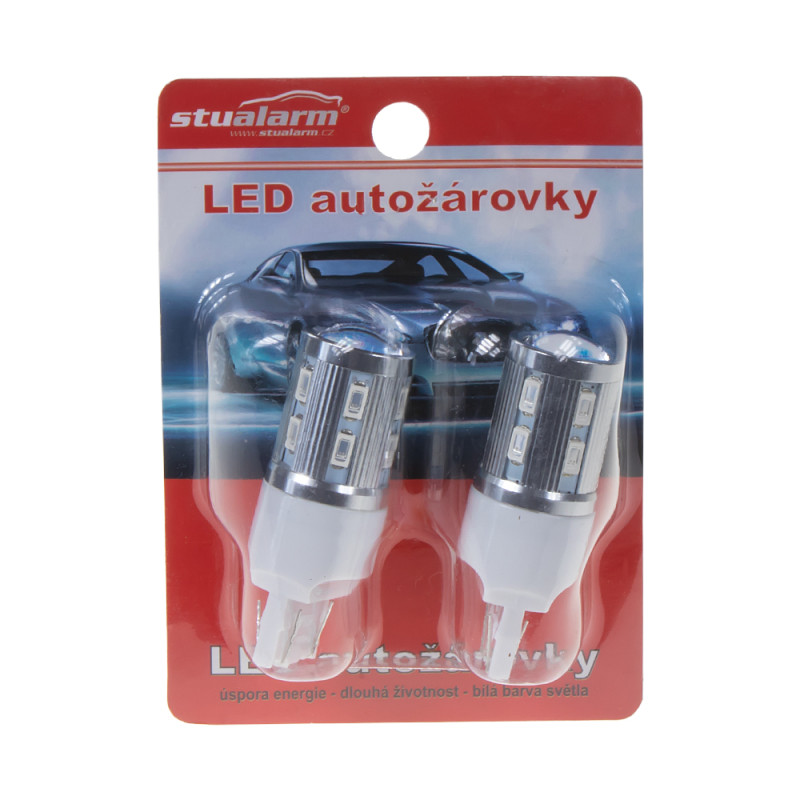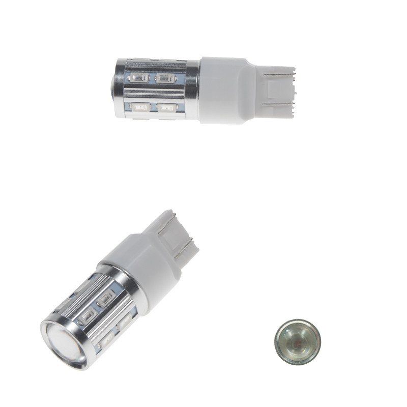 Náhradní LED žárovka s paticí T20 (3157 - W2,5x16d ), dvouvlákno, bílá, s vestavěným rezistorem (nehlásí závady řídící jednotky na žárovce u nových vozidel), 16x vysocesvítivé 3-čipové SMD LED diody. Tato žárovka se používá především v automobilech dovezených z USA automobilky Dodge, Ford, Chrysler.