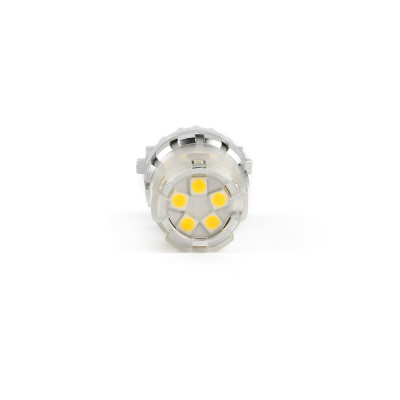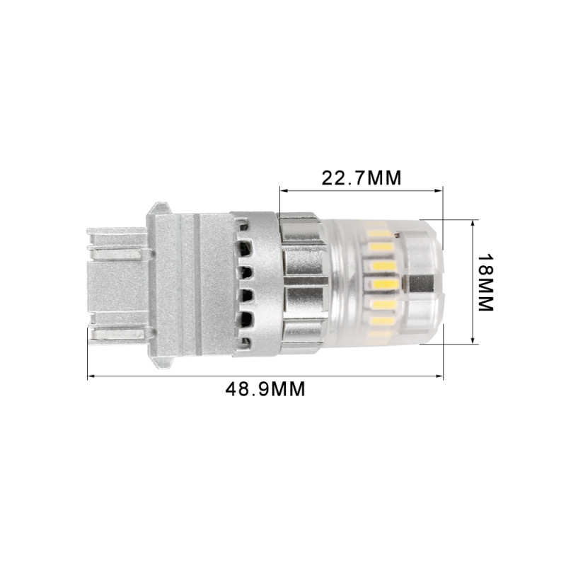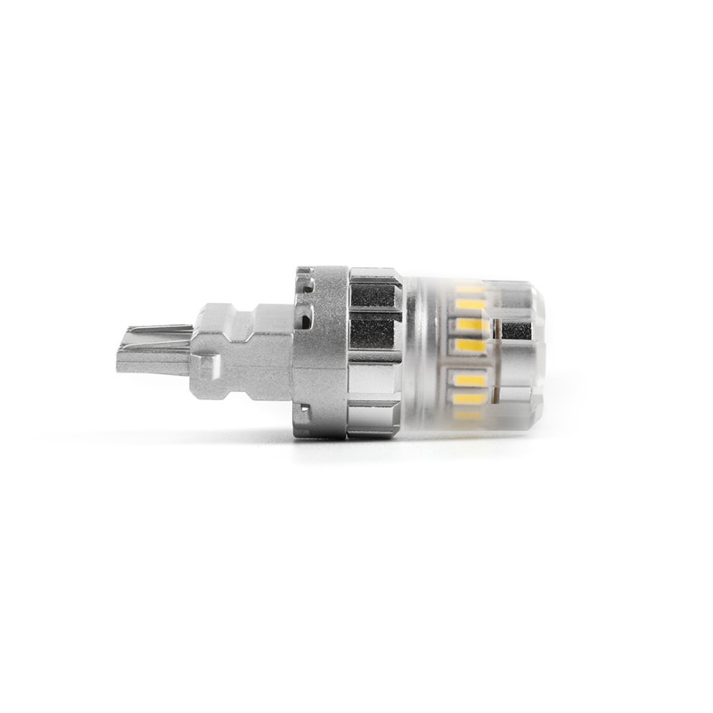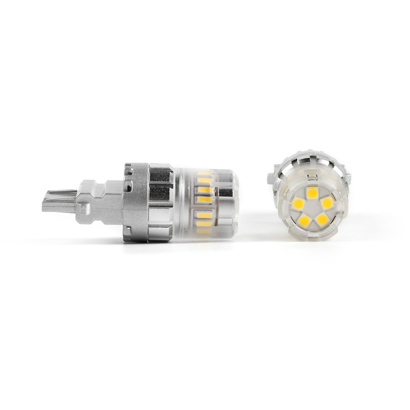 Náhradní LED žárovka s paticí T20 (7443 - W3x16q ), oranžová, dvouvlákno, 18 3-čipových SMD LED diod, napájecí napětí 12 V. Tato žárovka se používá především v automobilech dovezených z USA automobilky Dodge, Ford, Chrysler.