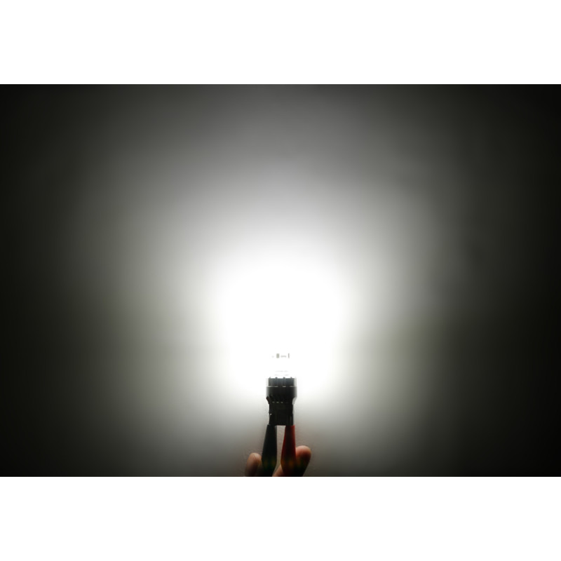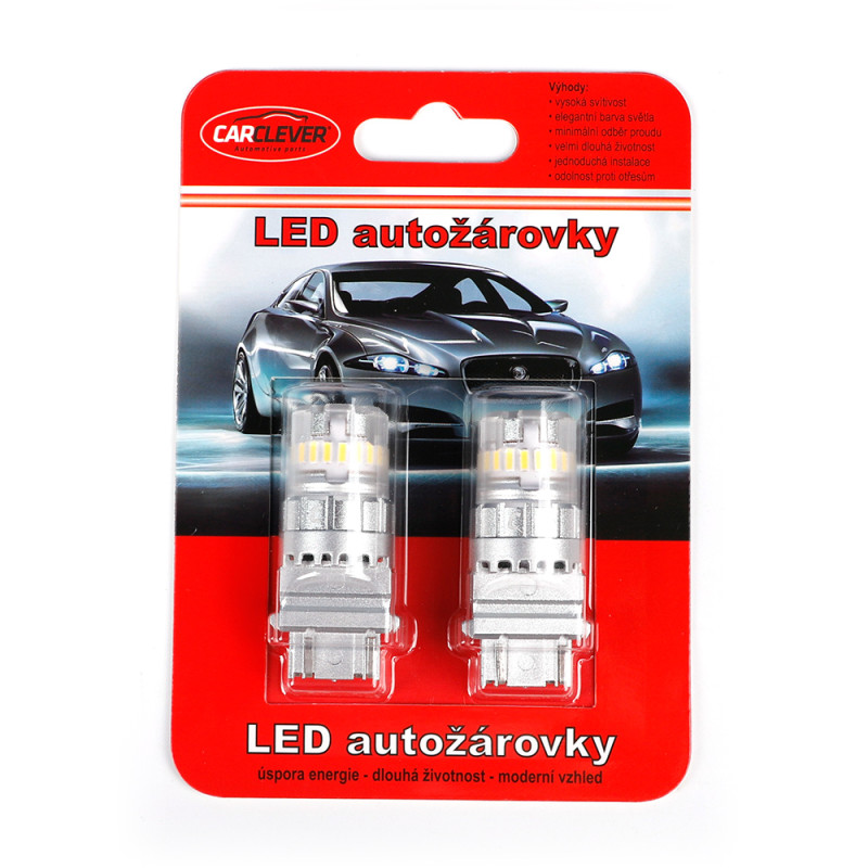 Náhradní červená LED žárovka s paticí T20 (3157 - W2,5x16d ), bílá, s vestavěným rezistorem ( nehlásí závady řídící jednotky na žárovce u nových vozidel), 16x vysocesvítivé 3-čipové SMD LED diody. Tato žárovka se používá především v automobilech dovezených z USA automobilky Dodge, Ford, Chrysler.