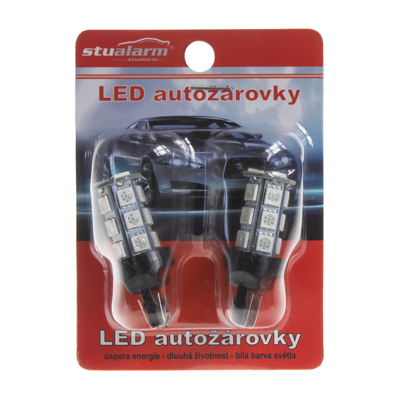 Náhradní LED žárovka s paticí T20 (3157 - W2,5x16d ), dvouvlákno, bílá, s vestavěným rezistorem (nehlásí závady řídící jednotky na žárovce u nových vozidel), 16x vysocesvítivé 3-čipové SMD LED diody. Tato žárovka se používá především v automobilech dovezených z USA automobilky Dodge, Ford, Chrysler.