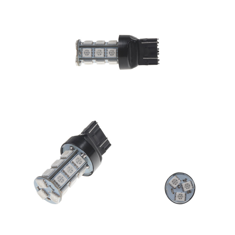 Náhradní LED žárovka s paticí T20 (7443 - W3x16q ), červená, dvouvlákno, 18 3-čipových SMD LED diod. Tato žárovka se používá především v automobilech dovezených z USA automobilky Dodge, Ford, Chrysler.