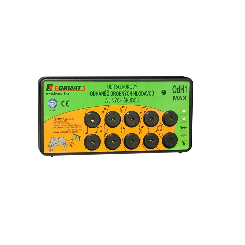 ► Zvukovo-ultrazvukový elektronický odháňač myšou, kún, krýs, lasičiek a potkanov. Jedná sa o rýdzo český produkt s dlhoročnou tradíciou na trhu (od r. 1991) vyrábaný priamo u nás vo firme FORMAT1 spol. s r. o. Spoľahlivý, výkonný, za dobu viac ako 29 rokov overený mnohými zákazníkmi. Neškodný ako pre človeka a domáce hospodárske zvieratá.Prístroj vytvára pre škodcov nepríjemné zvukové prostredie (v oblasti hranice počuteľného zvuku a ultrazvuku), škodcovia postupne opustí chránený priestor. Prístroj je teda úplne humánne, nezabíja zvieratá, neškodí im, iba im znepríjemní pobyt v chránenom priestore, teda je odháňa. Nevyužíva žiadnych chemických prísad.Vzhľadom k tomu, že vyluzování zvuky sú na hranici počuteľného pásma, nie je vhodný do obývaných priestorov (obývačka, kychyň pod.)