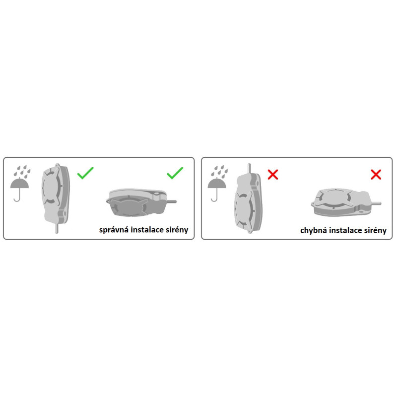 Siréna musí být namontována v poloze, která zabraňuje hromadění vody v krytu.