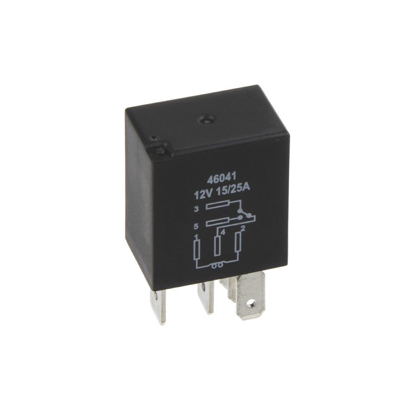 Miniaturní přepínací relé 12 V, 15 / 25 A, dioda na cívce relé (katoda na kontaktu 1, anoda na kontaktu 2), rozměry 23 x 15 x 26 mm