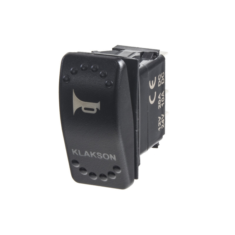 Tlačítko ROCKER kolébkové hranaté s červeně podsvíceným symbolem trumpety a nápisem KLAKSON, pro napájecí napětí 12 V / 20 A - 24 V / 10 A, rozměr otvoru 37 x 21 mm, LED podsvícení.