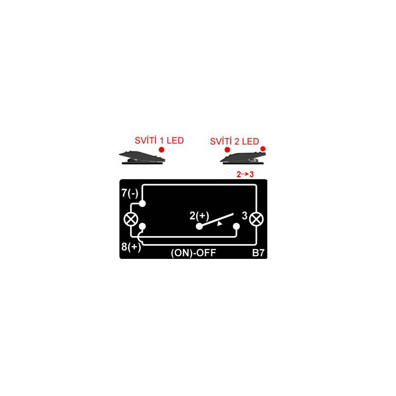 Spíná kladné napětí mezi kontakty 2 (vstup +) a 3 (výstup +), 8 je kostra pro LED, 6 + pro podsvícení, 7 je kostra pro podsvícení.