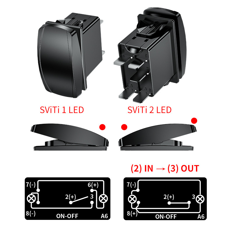 Spínač ROCKER2 kolébkový hranatý s červenou LED kontrolkou, pro napájecí napětí 12 V / 20 A - 24 V / 10 A, rozměr otvoru 37 x 21 mm.