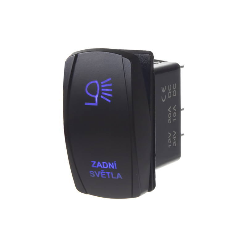 Spínač ROCKER kolébkový hranatý s červeně podsvíceným symbolem světel a nápisem ZADNÍ SVĚTLA, pro napájecí napětí 12 V / 20 A - 24 V / 10 A, rozměr otvoru 37 x 21 mm, LED podsvícení.