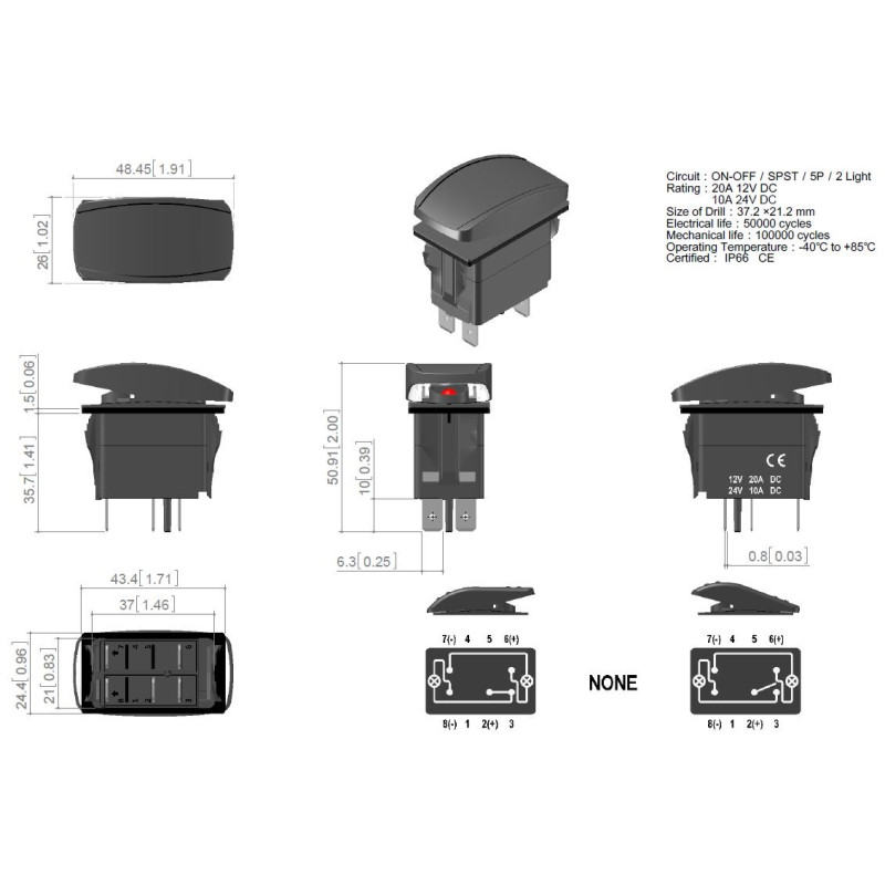 Spínač ROCKER2 kolébkový hranatý s červenou LED kontrolkou, pro napájecí napětí 12 V / 20 A - 24 V / 10 A, rozměr otvoru 37 x 21 mm.