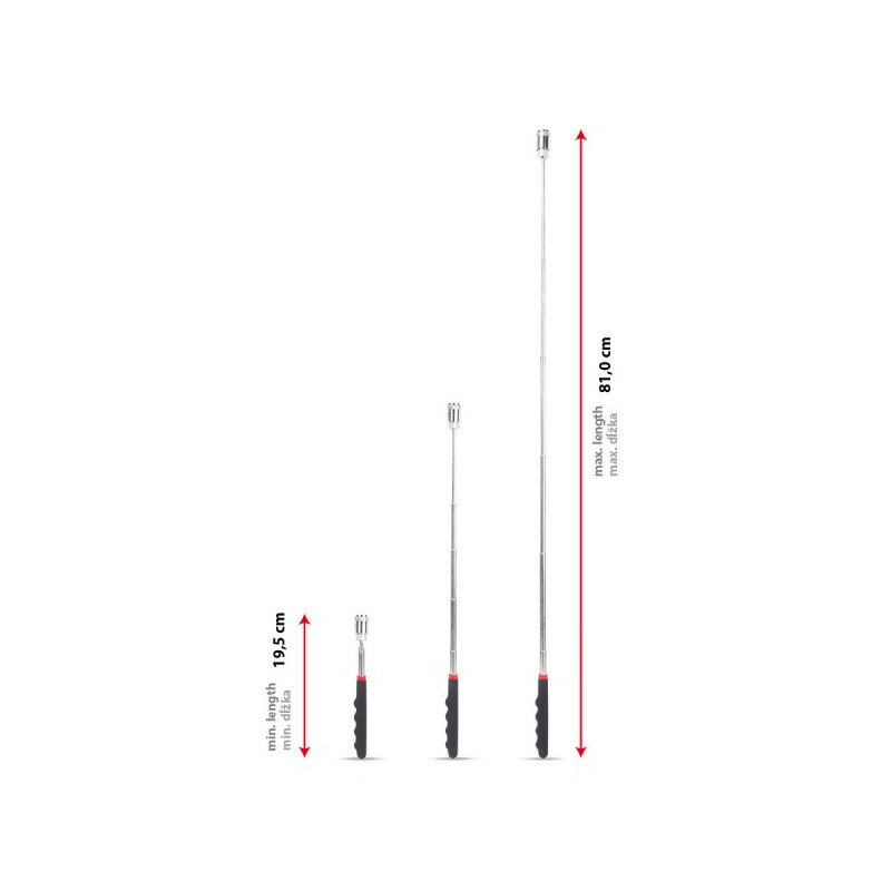 ► Magnetická pomôcka s LED, poskytuje viditeľnosť v tme a je veľmi užitočná pomôcka na vyberanie najmä v úzkych priestoroch, ľahké nájdenie a uchopenie drobností na ťažko dostupných miestach. Vďaka magnetickému teleskopu si môžete nastaviť vhodnú dĺžku
