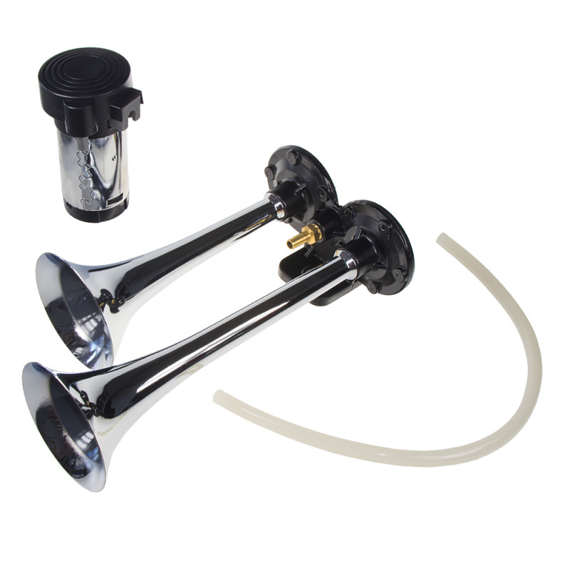 2-trubková fanfára poháněná vzduchovým kompresorem dodávaným v sadě.Trubky jsou vyrobeny z pochromovaného ABS plastu. Kompresor je spojen pevně s trubkami