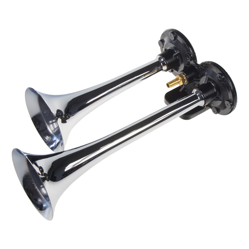 2-trubková fanfára poháněná vzduchovým kompresorem dodávaným v sadě. Trubka je vyrobena z velice odolné zinkové slitiny a povrch je pochromován. Je vhodná pro pohledovou montáž na karoserii vozu nebo do náročnějších klimatických podmínek. V sadě jsou dodávány také hadice a drobný montážní materiál.