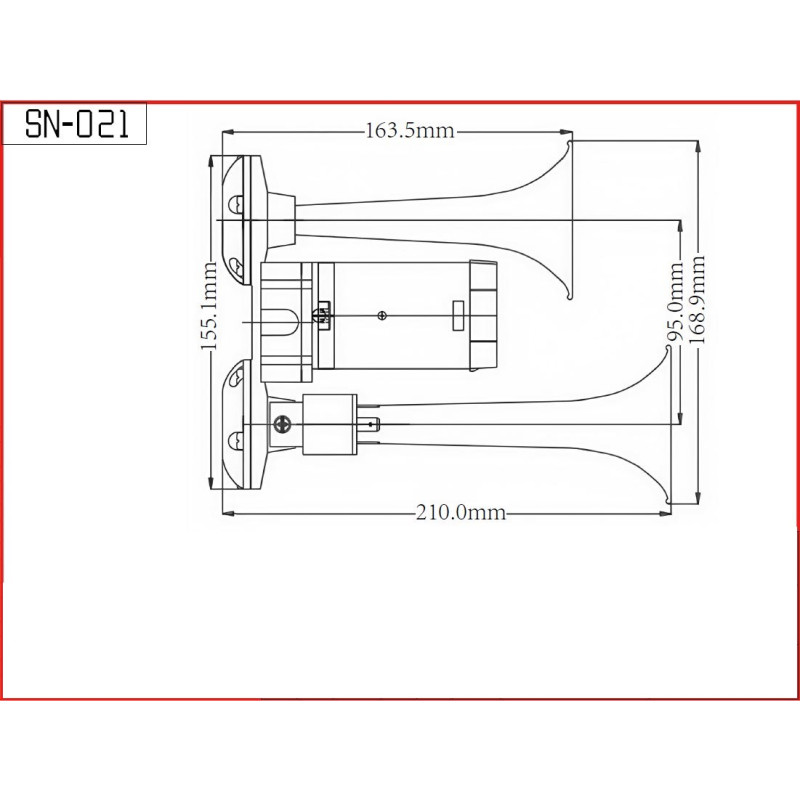 2-trubková fanfára poháněná vzduchovým kompresorem dodávaným v sadě.Trubky jsou vyrobeny z pochromovaného ABS plastu. Kompresor je spojen pevně s trubkami
