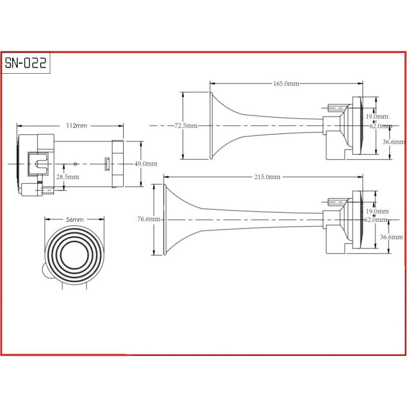 2-trubková fanfára poháněná vzduchovým kompresorem dodávaným v sadě.Trubky jsou vyrobeny z pochromovaného ABS plastu. Kompresor je spojen pevně s trubkami