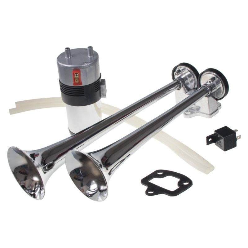 2-trubková fanfára poháněná vzduchovým kompresorem dodávaným v sadě.Trubky jsou vyrobeny z pochromovaného ABS plastu. Kompresor je spojen pevně s trubkami