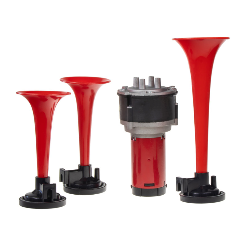 2-trubková fanfára poháněná vzduchovým kompresorem dodávaným v sadě.Trubky jsou vyrobeny z pochromovaného ABS plastu. Kompresor je spojen pevně s trubkami