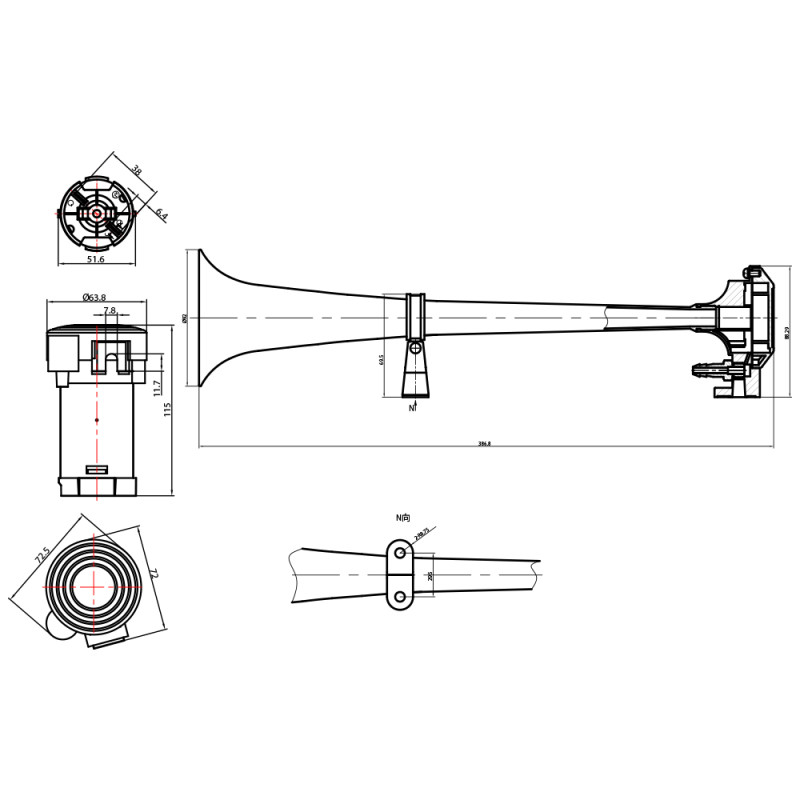 Fanfára poháněná vzduchovým kompresorem dodávaným v sadě. Trubka je vyrobena z velice odolné zinkové slitiny a povrch je pochromován. Je vhodná pro pohledovou montáž na karoserii vozu nebo do náročnějších klimatických podmínek. V sadě je dodávána také hadice a drobný montážní materiál.