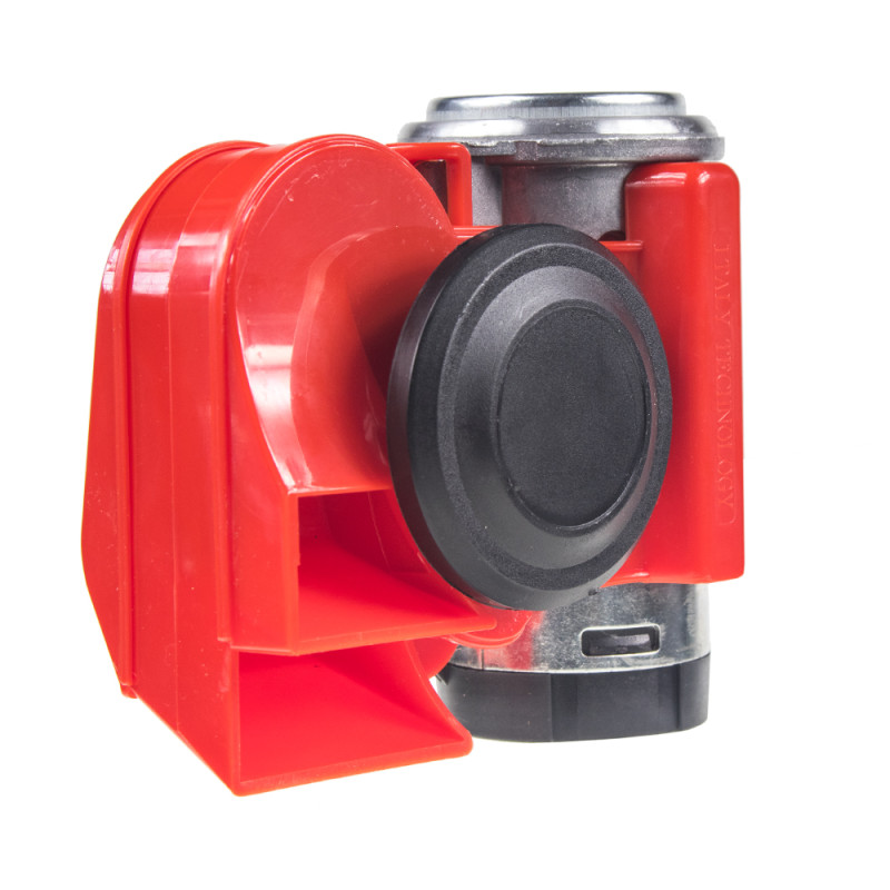 Šneková fanfára (klakson) s integrovaným vzduchovým kompresorem. Součástí balení je spínací relé a šroub s matkou pro uchycení.