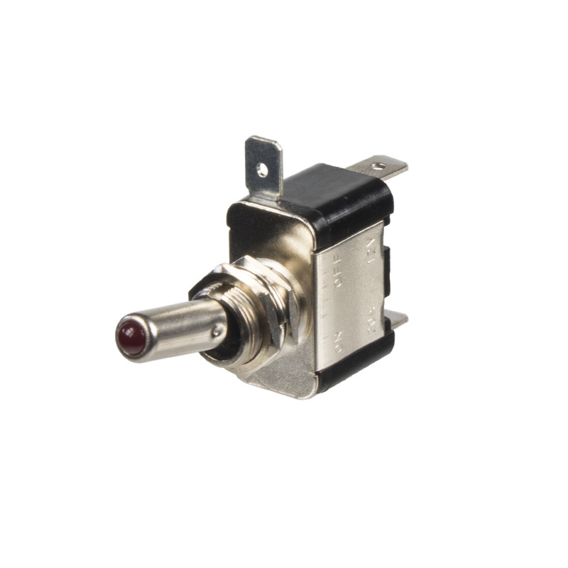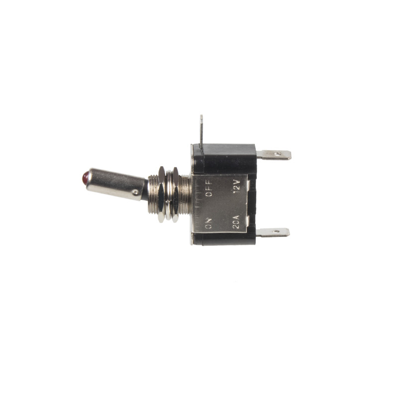 Elektrický spínač - páčkový 12 V - 20 A s červenou LED. Letecký typ páčkového přepínače. Možno dokoupit plastovou krytku spínače samostatně.