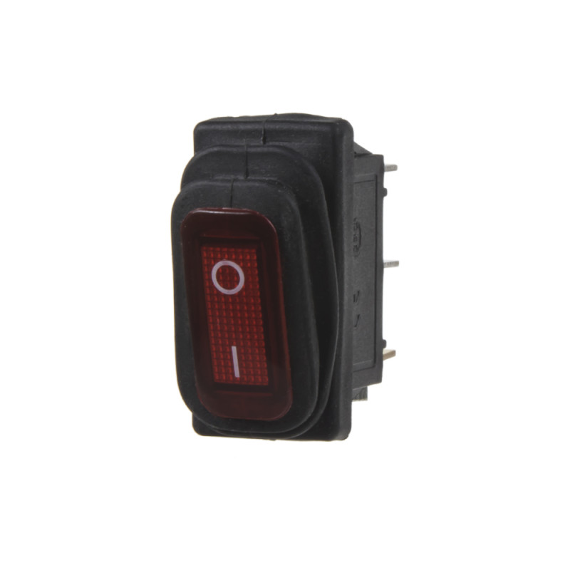 Spínač kolébkový hranatý voděodolný 20 A červený s podsvícením, napájecí napětí 12V, do otvoru 10 x 29 mm.