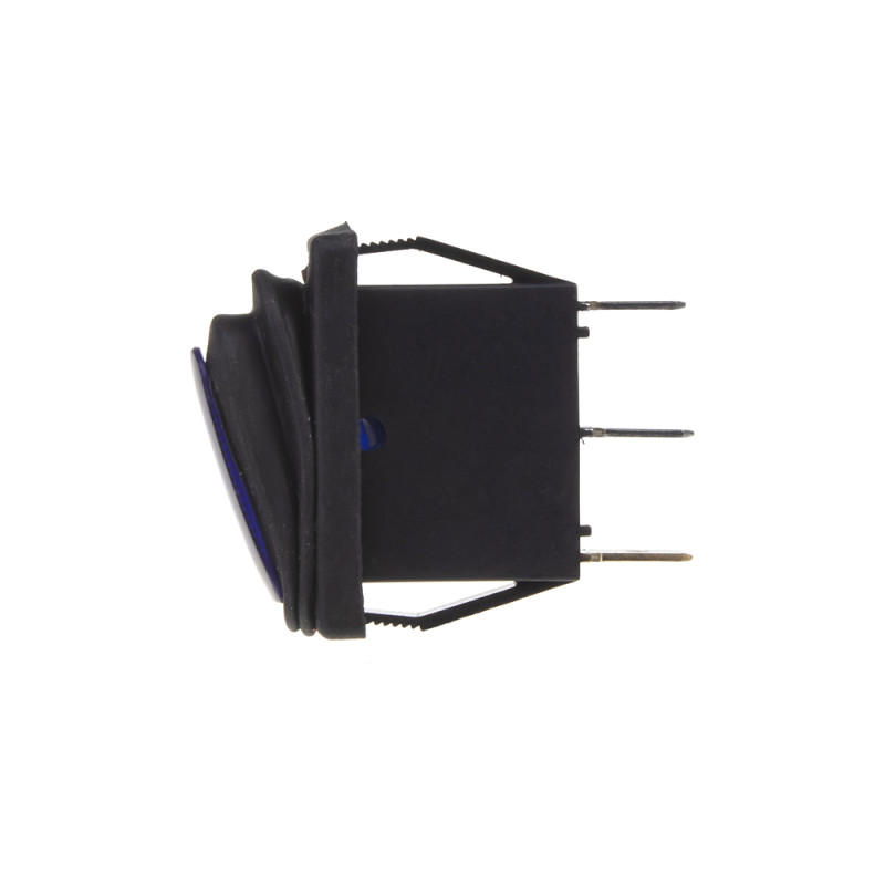 Spínač kolébkový hranatý voděodolný 20 A modrý s podsvícením, napájecí napětí 12V, do otvoru 10 x 29 mm.