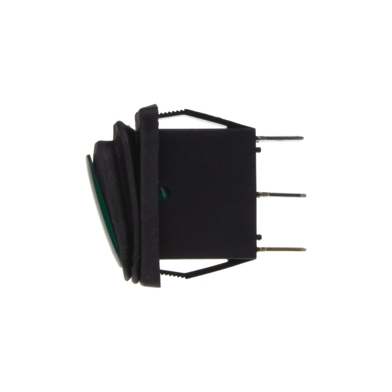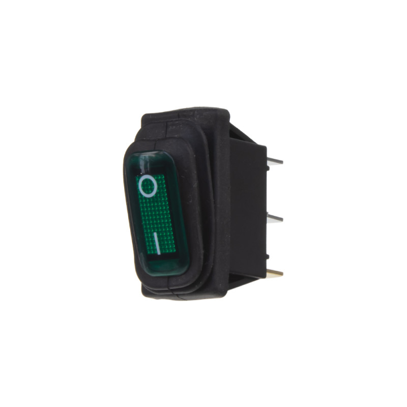 Spínač kolébkový hranatý voděodolný 20 A zelený s podsvícením, napájecí napětí 12V, do otvoru 10 x 29 mm.