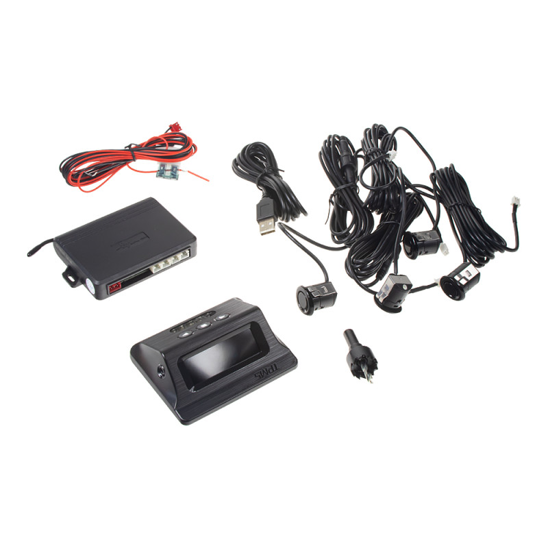 Parkovací systém s LED displejem, zadní s 4 čidly je určený pro detekci překážek za vozidlem. Speciálně tvarované senzory jsou určeny pro vnější montáž (např. pro vozidla s kovovými nárazníky).