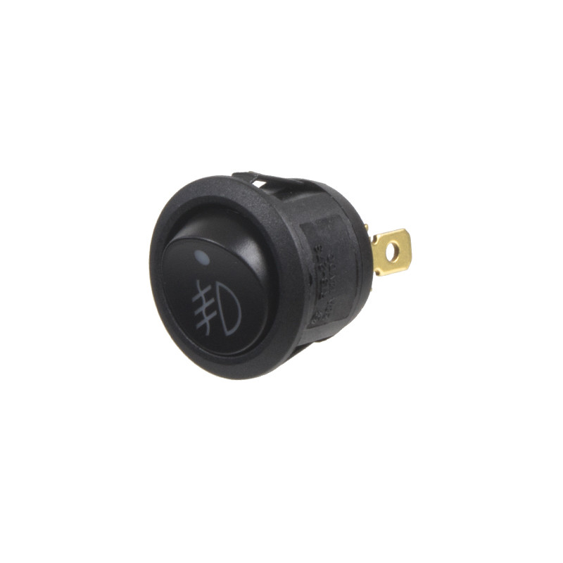 Spínač kolébkový kulatý 20 A s oranžově podsvíceným symbolem zadní mlhová světla a červenou kontrolkou, pro napájecí napětí 12 V / 20 A, průměr otvoru 20,2 mm.