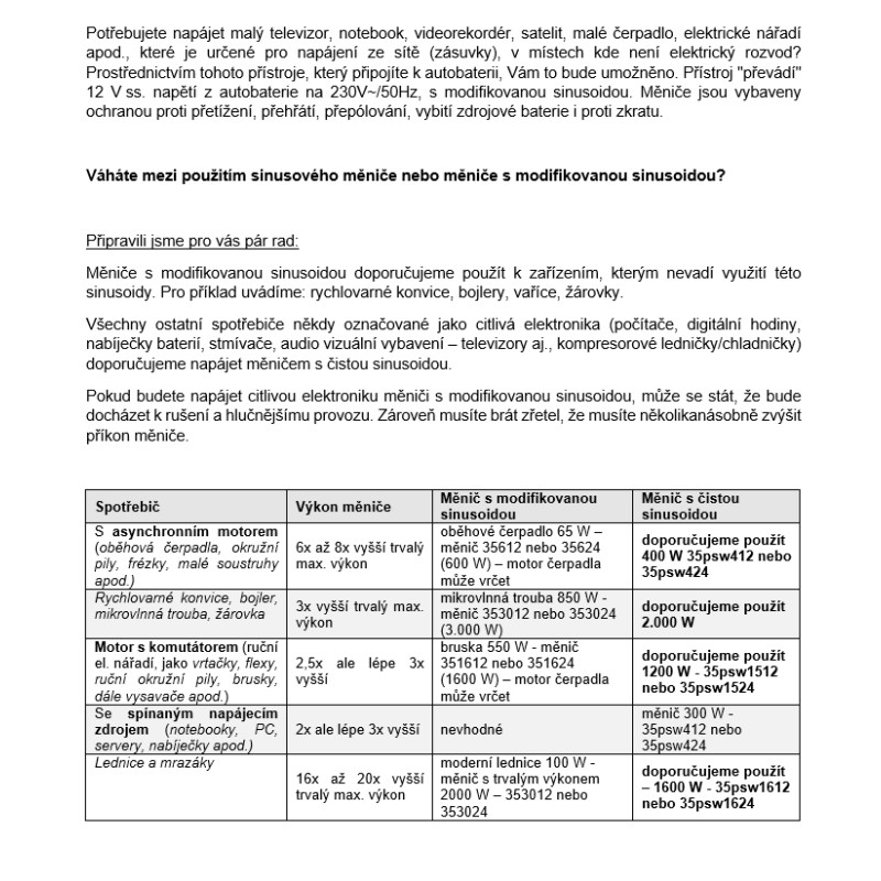 UPOZORNĚNÍ: Váháte mezi použitím sinusového měniče nebo měniče s modifikovanou sinusoidou? Mezi obrázky naleznete tabulku s doporučeným výkonem měničů. Od 14.9.2015 již nebudeme brát při reklamaci zřetel na přetížený měnič.