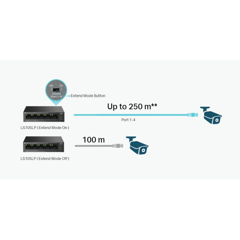 ► Prenos PoE až na 250 m: S režimom Extend dosahuje prenosová vzdialenosť PoE až 250 m, čo je ideálne na nasadenie sledovacích kamier vo veľkých priestoroch.