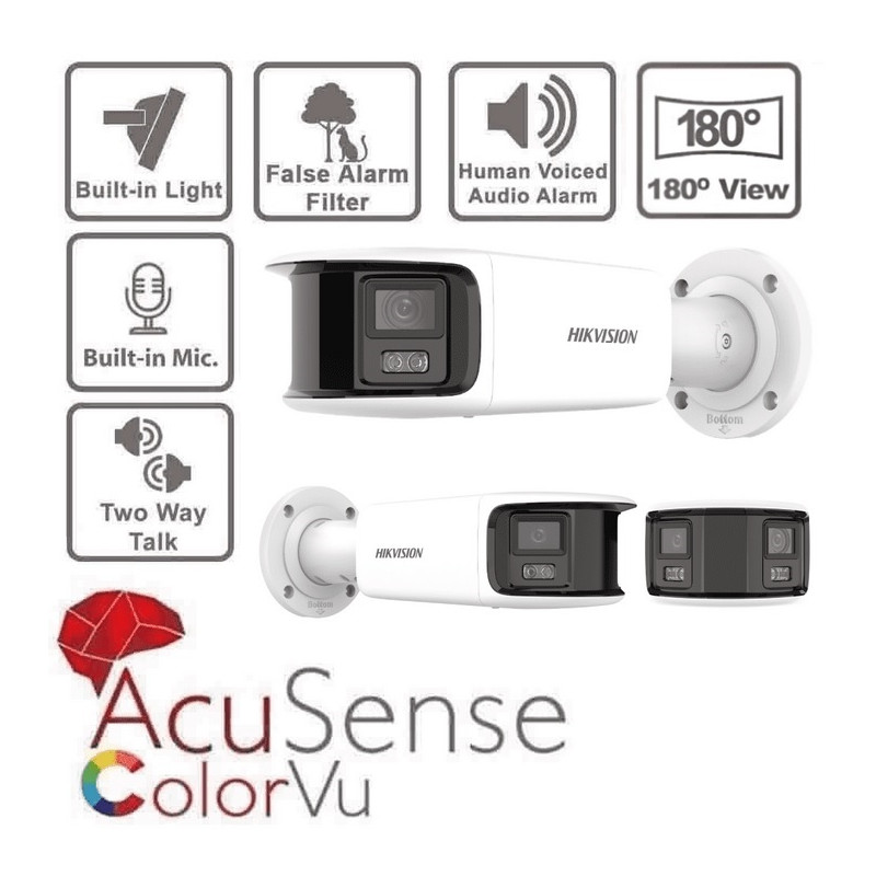 2x1/2,5" CMOS čip Progressive Scan Rozlíšenie 3040 x 1368@25sn/s 2x vstavaný objektív 2,8mm Zorné pole: horizontal 180°, vertical FOV 44° Clona F1.0 - Pokročilá technológia snímača dokáže výrazne zlepšiť využitie dostupného svetla a vytvára tak jasnejší obraz. Citlivosť: 0,0005 Lux @ (F1.0, AGC ON) B/W: 0Lux pri LED prísvite WDR - kompenzácia protisvetla: 130dB Polohovanie kamery v rozsahu 0°-355° horizontálne, 0°-90° vertikálne, 0-360° rotácia LED prísvit s dosahom 40m Kompresia H.265+/H.265/H264+/H.264/MJPEG SMART funkcie ColorVu 2. generácia - technológia dokonalého farebného videnia pri zapnutom prísvite Technológia Acusense – pokročilá analýza odfiltrovania falošných poplachov a spoľahlivá detekcia osôb a vozidiel Podporuje lokálny záznam na microSD/SDHC/SDXC kartu do 256GB Audio IN/OUT - 1/1 Alarm IN/OUT - 1/1 Vstavaný mikrofón a reproduktor (97dB) Stroboskopické svetlo (blikač) Krytie IP67 Resetovacie tlačidlo API: ONVIF (PROFILE S, PROFILE G), ISAPI, SDK, ISUP Max. 6 súčasných klientskych prístupov Až 32 užívateľov, 3 úrovne (administrátor, operátor, užívateľ) 1x RJ45 10M/100M Napájanie: 12 VDC ± 25%, 0,88 A, max. 10,5 W / PoE (802.3af) Class 3, 36 V - 57 V, 035 A to 0,22 A, max 12,5 W Prevádzková teplota -30 °C až 60 °C Rozmery: 119× 105 x 307 mm Hmotnosť 1400g