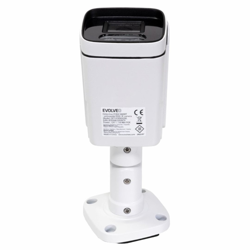 ► Vonkajšia celokovová kamera► IR nočný prísvit: 850nm 2x 3W IR LED► Dosvit IR: 15-20m► 1/2,9" 2Mp CMOS snímač► Objektív šošovka: 4mm f=2,4, pevný, horizontálny uhol 84°, vertikálny uhol 45°► Full HD 1080p 30fps záznam► Kompresia záznamu: H.265► LAN RJ45 konektor 10/100M (Podporuje POE 48V napájanie)► DC Jack - napájací konektor► Pracovná teplota: -15°C/+50°C► Rozmery kamery ŠxVxD: 70 x 55 x 185 mm► Rozstup skrutiek pre montáž: 47 x 47 mm► Spotreba max.: 12 W► Balenie: 1x Bullet IP66 kamera s nočným prísvitom, 1x napájací adaptér DC 12V 1A, 1x sada na upevnenie kamery, Užívateľský manuál► Kameru je možné spárovať s NVR kamerovými systémami EVOLVEO Detective radu SMART► Možné použiť aj samostatne s akýmkoľvek kamerovým systémom, ktorý podporuje štandard ONVIF► Rozširujúca IP kamera pre kamerové systémy:* EVOLVEO Detective WN8 SMART* EVOLVEO Detective IP8 SMART* EVOLVEO Detective POE8 SMART