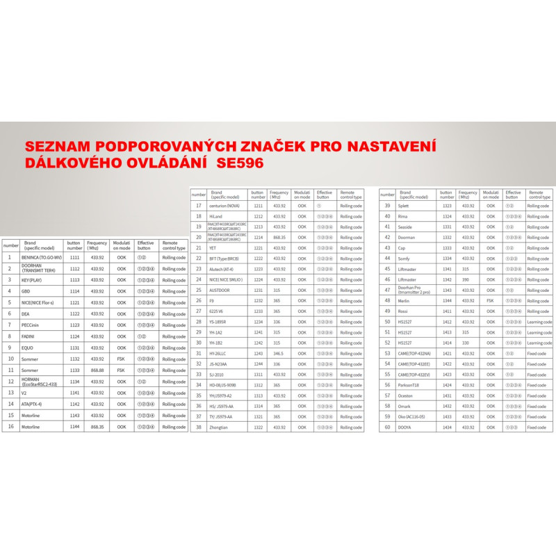 Ovladač podporuje všechny pevné kódy a plovoucí kódy uvedených 71 výrobců ovladačů (např. Hormann, Came, Nice, Sommer, Faac, Liftmaster a další).
